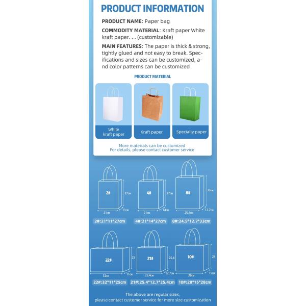 | | Customized. | | | 45gsm-210gsm or Customized. | | | CMYK/Pantone color, up to 10 colors. | | | Eco-friendly Water-based Soy Ink. | | | Brown Kraft Paper, White Kraft Paper, Art Paper, Ivory Board, Duplex Board, Specialty Paper, or Custom Paper. | | | Glossy/Matt Lamination, Gold/Silver Hot Stamping, Embossing, UV Coating, Foil Stamping, Hologram Effect, etc. | | | Offset Printing/Flexo Printing | | | Twisted Handles, Flat Handles, Ribbon, PP Rope, Cotton, Nylon, Die-cut or Customized Handle. | | | Shopping, Gift, Wedding, Grocery, Retail Merchandise, Party, Apparel,Promotion, Restaurant Take-away, baking,etc. | | | FSC Certified 100% Recyclable, Automatic Machine Making, Eco-friendly, Durable, and Accurate Nice Printing. | | | Advanced Equipment and Experienced QC Team will check material, semi-finished and finished products strictly in every step before shipping. | |